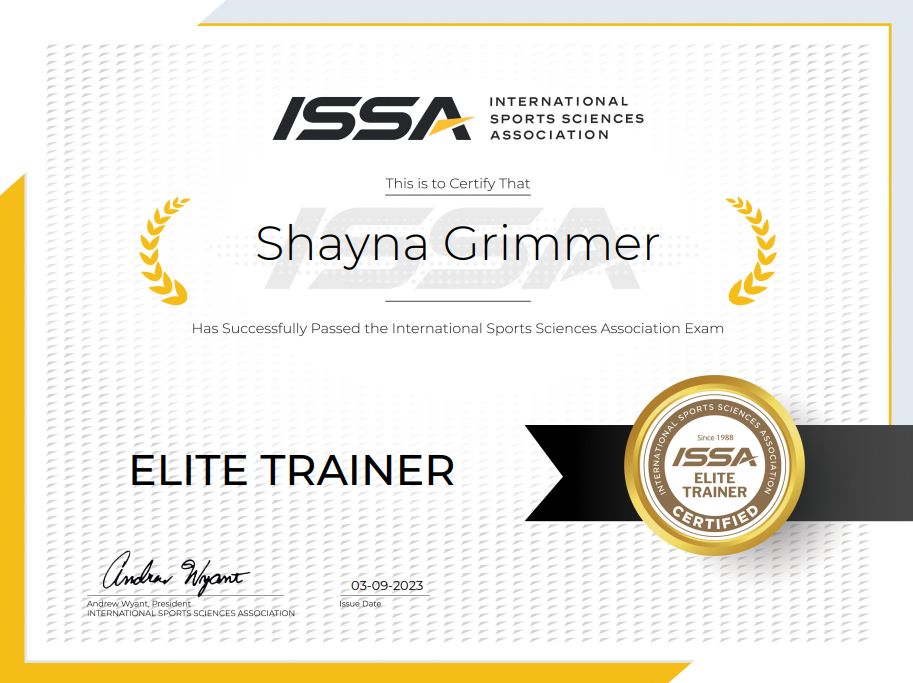 I have completed ISSA’s Online Certification. This has provided me with the knowledge and tools to properly track client progressions, and how to design programs and navigate distanced clients. Personally, much of this knowledge and experience has come from my 8+ years of training clients and this certification was merely a formality and a form of qualification.